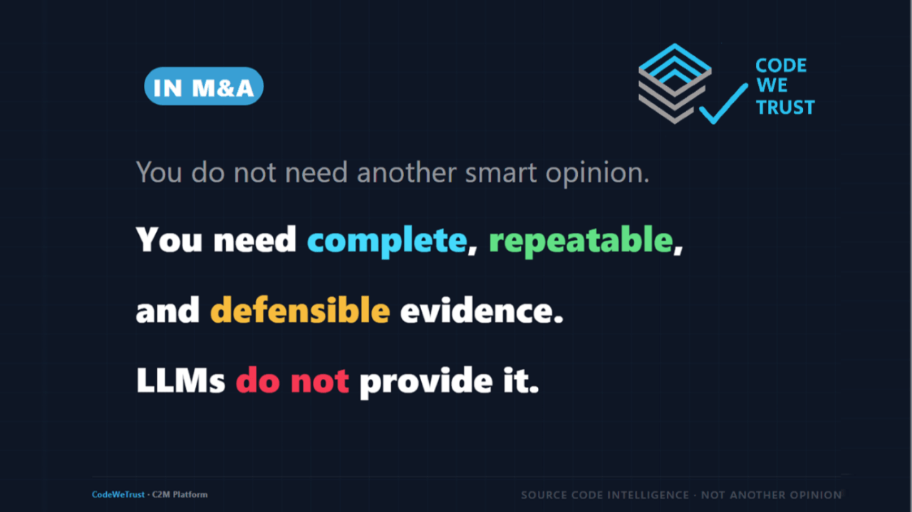 In high-stakes software decisions, confusing LLMs with full code analysis tools can lead to dangerously incomplete insights. While models like Claude.ai excel at interpreting and explaining code, they rely on partial visibility. In contrast, platforms like C2M systematically analyze entire codebases to deliver measurable, audit-grade risk exposure. Ultimately, it’s not a competition—but a layering of measurement and interpretation where completeness is non-negotiable.
